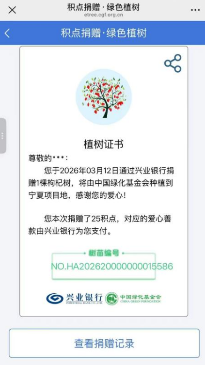 “积点捐赠植树”活动以“小积点”撬动“大公益”,客户通过手机银行即可使用所持积点捐赠枸杞树苗,一键参与绿色生态共建。捐赠完成后,中国绿化基金会将为每位参与者颁发专属电子植树证书,让每一份绿色贡献有迹可循、有爱可记。兴业银行将捐赠苗木数量按规则精准折