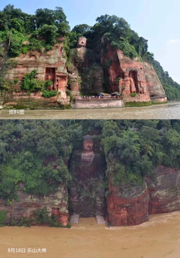 8月18日,四川省启动了历史上的首次Ⅰ级防汛应急响应,在乐山大佛佛脚观景平台上,水已淹没至大佛脚趾,这也是1949年以来,乐山大佛首次被洪水淹至脚趾。