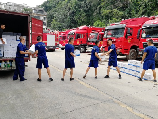 乐山消防支队的消防队员们和伊利工作人员一起搬运物资