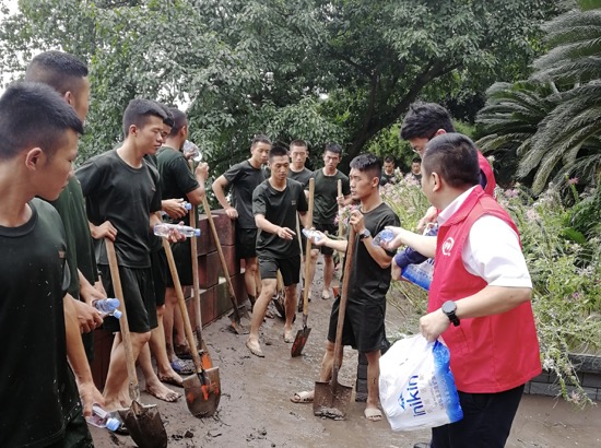 伊利的工作人员为执行清淤任务的抗洪战士们送去伊刻活泉