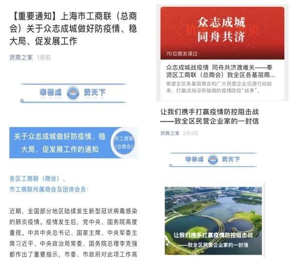上海奉贤区工商联于1月26日及时转发市工商联《关于众志成城做好防疫情、稳大局、促发展工作的通知》,并在1月27日就向全区各基层商会及其广大民营企业家发出《众志成城战疫情,同舟共济渡难关》的倡议书。1月29日,及时召开党组会议,研究部署疫情防控工作,明确疫情防控工作是当前最重要、最紧迫的工作。2月3日、2月9日两次召开党组视频会议,分析企业复工形势、明确下阶段防疫工作重点。同时,2月3日,区工商联发出了致全区民营企业家的一封信《让我们携手打赢疫情防控阻击战》,感谢全区民营企业在参与疫情防控工作中作出的突出贡献,同时也对民营经济人士下阶段参与疫情防控工作作出坚定政治立场、务实复工举措、争当防疫表率等要求。2月8日工商联3号文《奉贤区工商联(总商会)关于进一步做好新阶段疫情防控及相关工作的通知》,对广大民营经济人士和工商联所属商会如何统筹协调有序推进疫情防控和其他各项工作,确保奉贤经济的高质量发展提出具体要求。