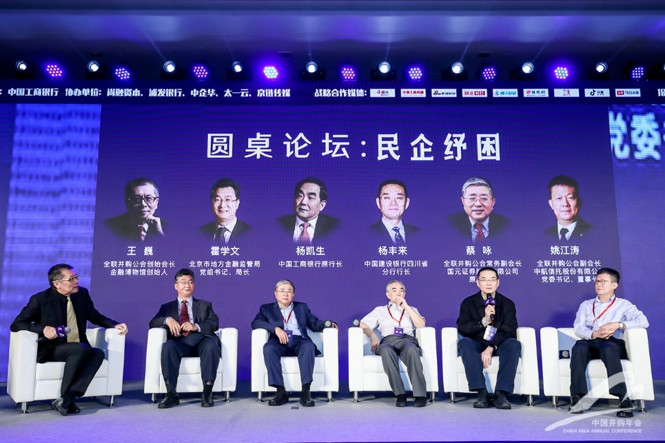 年会现场,在全联并购公会创始会长王巍的主持下,北京市地方金融监管局党组书记、局长霍学文,中国银保监会国际咨询委员会委员、中国工商银行原行长杨凯生,全联并购公会四川工作委员会主任、中国建设银行四川省分行行长杨丰来,全联并购公会常务副会长、国元证券股份有限公司原董事长蔡咏,全联并购公会副会长、中航信托股份有限公司党委书记、董事长姚江涛五位嘉宾围绕“民企纾困”这一主题展开讨论对话。以下为圆桌论坛内容实录(根据速记稿整理,未经嘉宾本人确认):