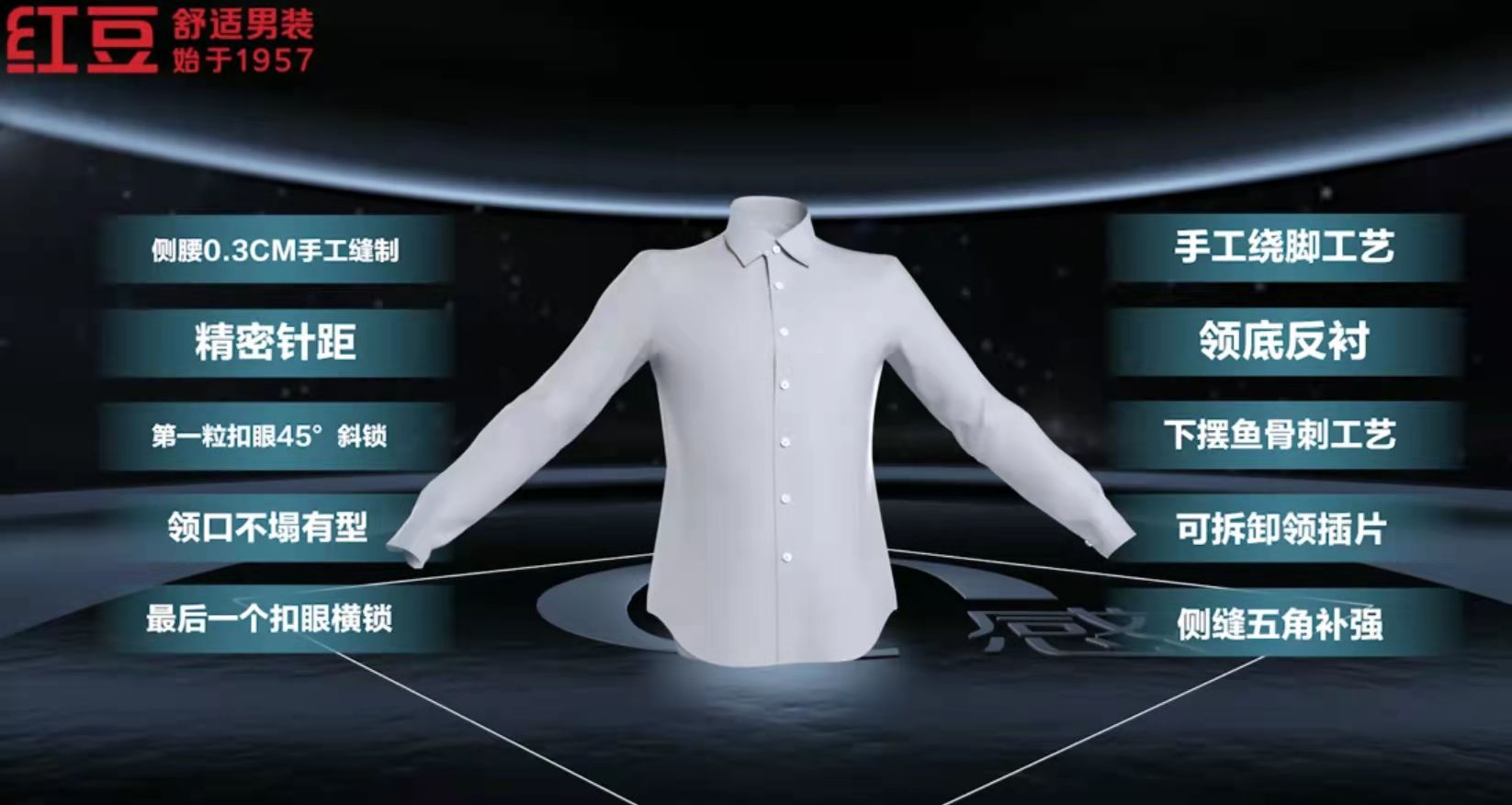 从面料来看,经过反复实验,红豆最终选择采用中国、奥地利两国原料混纺,并首创红豆超细旦纤维配比,在面料中加入瑞士HeiQ高分子聚合物,让衬衫“冷暖自知”,维持体表舒适温度,源自奥地利兰精TENCELModel纤维,如羽毛般柔软,吸湿力比棉纤维高50%,衬衫的整理便捷性与透气性得到提升。从工艺来看,7位10年以上经验的打版师首创红豆5项3D立体剪裁技术——“会呼吸的领子”“鸭蛋型袖笼”“抛物线后背”“降落伞袖口”“包容性肚围”,在舒适的基础上兼顾挺括有型。从辅料来看,衬衫采用德国Wendler万德伦高端专业衬衫有纺衬、Gutermann高端缝纫线,MCT微纤维包芯技术细度为13Tex、强度大有韧性,表面光洁毛羽少,纽扣采用景德镇24切面陶瓷,细节之中尽显低调奢华。