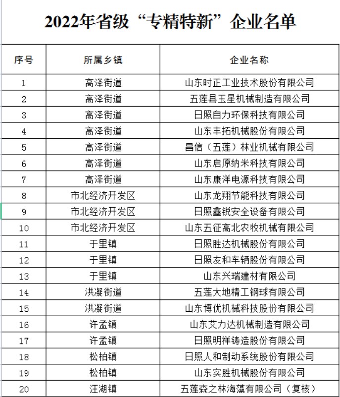 近日,山东省工信厅公布2022年度山东省“专精特新”中小企业公示名单,五莲县共有20家民营企业光荣上榜,上榜数量在日照市各区县中位列第一。