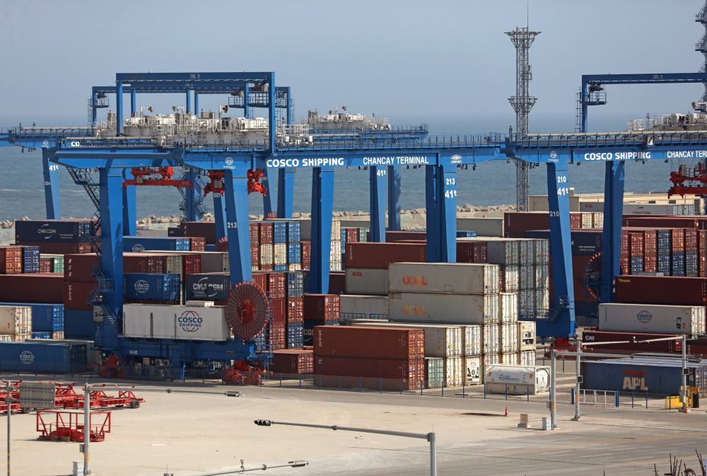 这是2025年10月7日拍摄的秘鲁钱凯港码头摆放的集装箱。位于秘鲁首都利马以北约80公里的钱凯港于2024年11月正式开港,标志着中秘共建“一带一路”取得新的重要成果。新华社发(玛丽安娜·巴索 摄)
