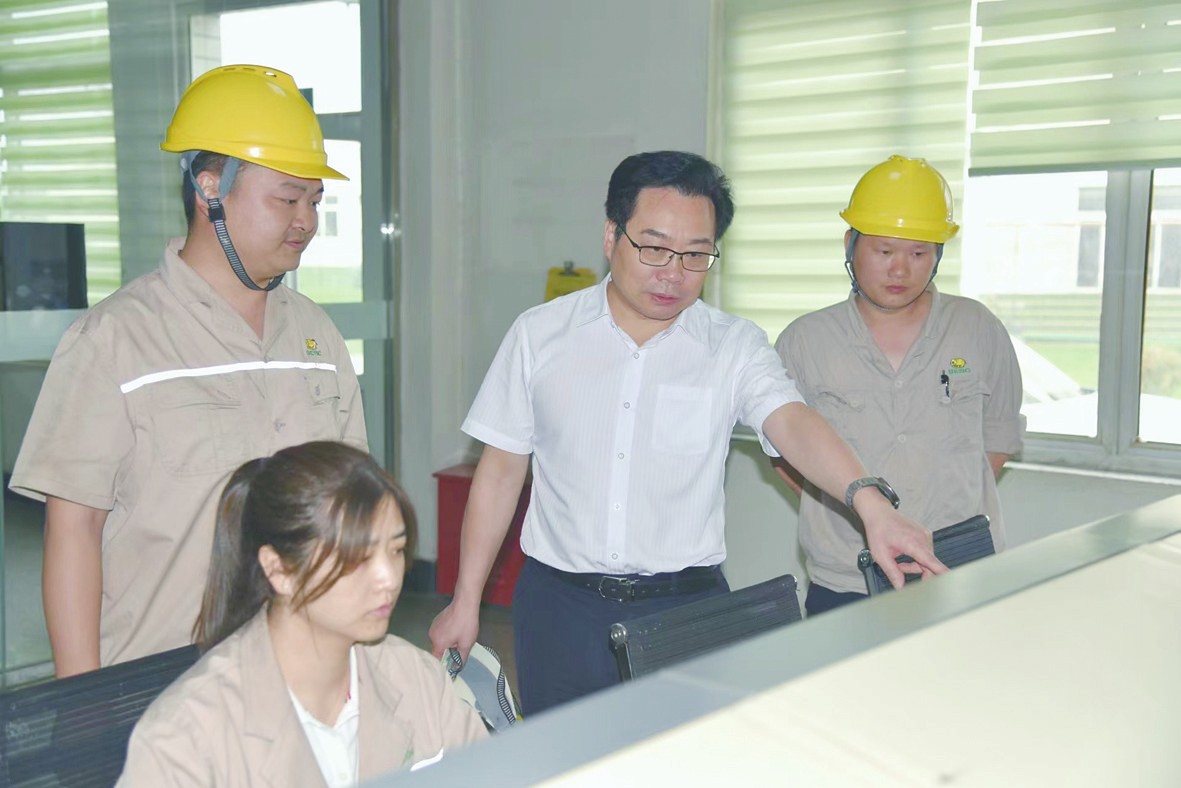 唐印(中)在车间了解情况,与技术人员和工人一起进行生产交流。