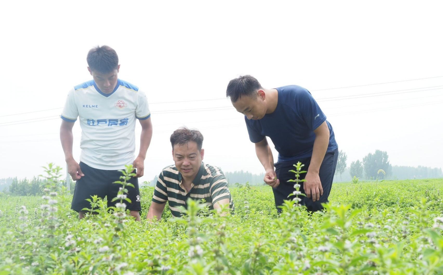 房富民(中)、房富岭(左)与花园镇工作人员察看留兰香长势