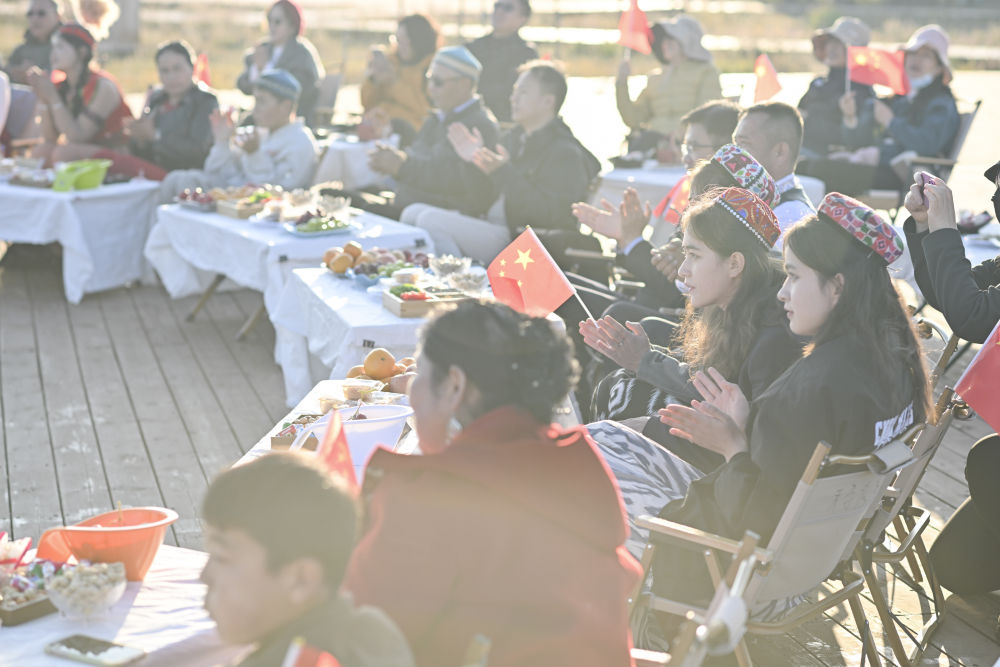 江苏泰州援疆干部人才与昭苏农牧民家庭代表齐聚,观看节目(2025年10月6日摄)。新华社记者 胡虎虎 摄