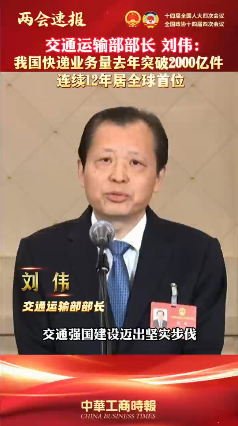 交通运输部部长刘伟:我国快递业务量去年突破2000亿件,连续12年居全球首位