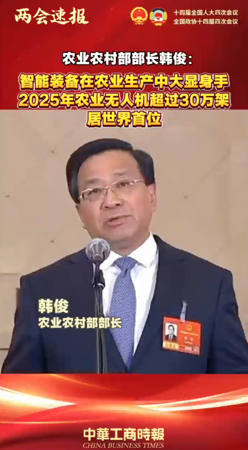 农业农村部部长韩俊:智能装备在农业生产中大显身手,2025年农业无人机超过30万架居世界首位