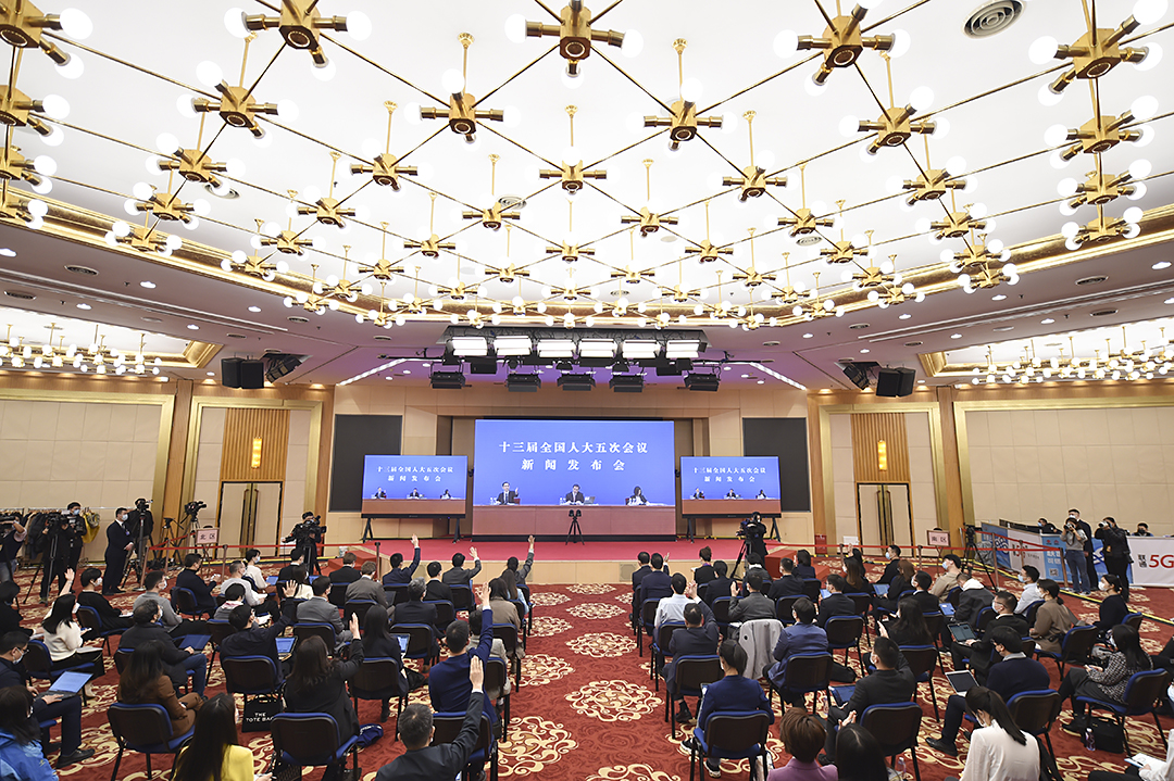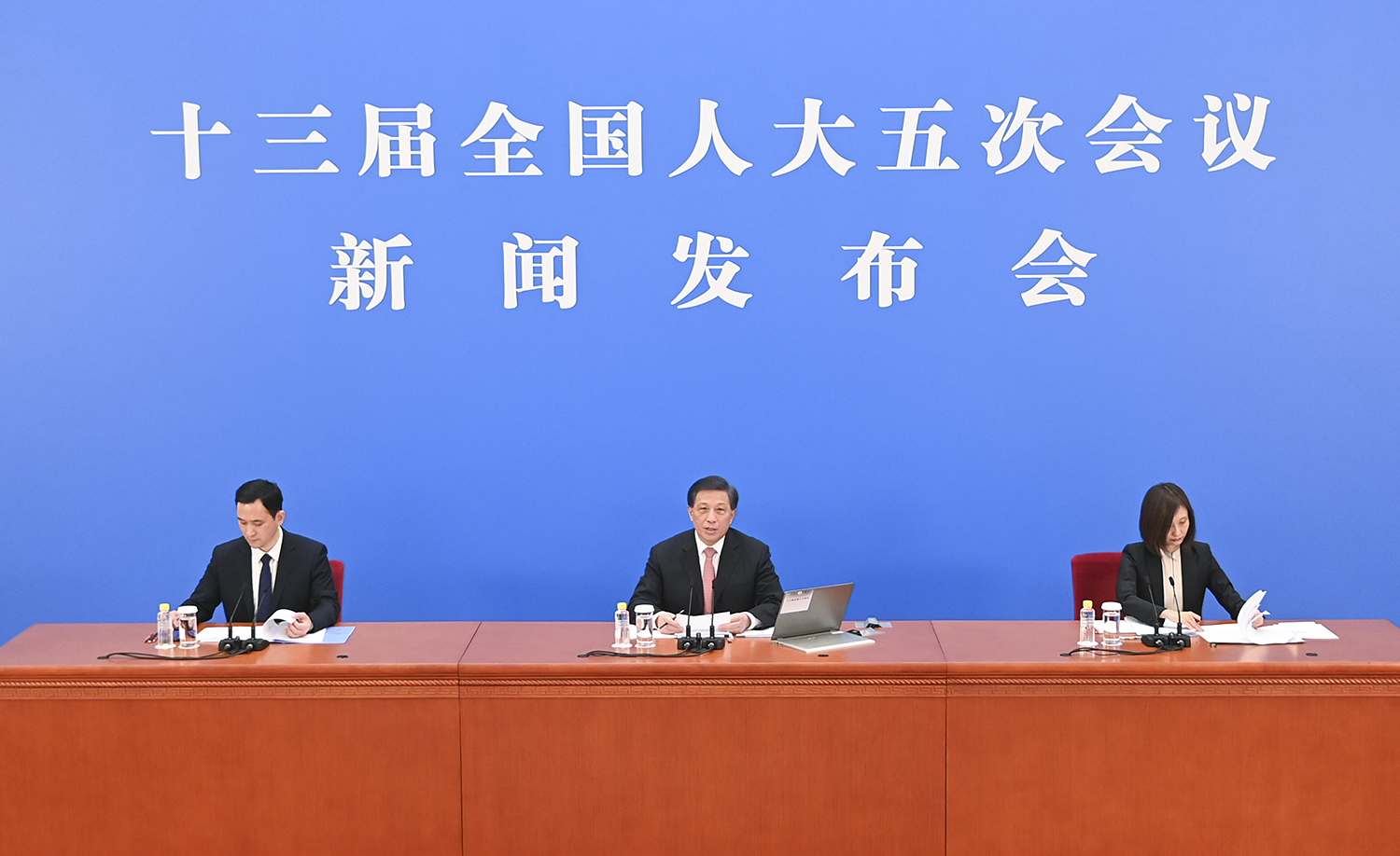 3月4日,十三届全国人大五次会议新闻发布会在北京人民大会堂新闻发布厅举行,大会发言人张业遂就会议议程和人大有关工作回答中外记者提问。(新华社记者 陈晔华 摄)