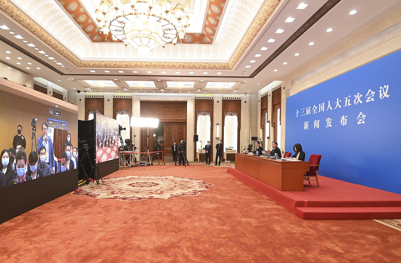3月4日,十三届全国人大五次会议新闻发布会在北京人民大会堂新闻发布厅举行,大会发言人张业遂就会议议程和人大有关工作回答中外记者提问。(新华社记者 陈晔华 摄)