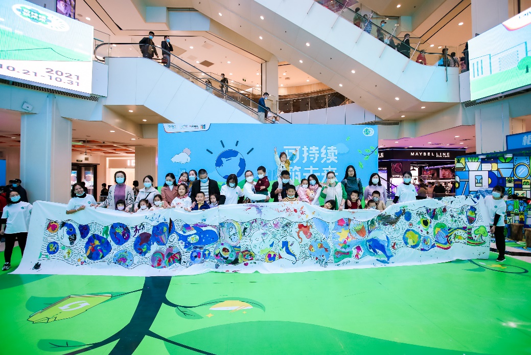 在凯德MALL·太阳宫举行的环保主题儿童共绘,小朋友和父母共同完成10米长卷