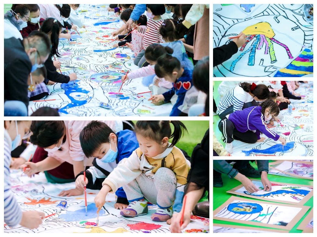 10月30日,30名小朋友齐聚凯德MALL·太阳宫,参与“可持续 筑未来”凯德公益生活节共绘活动。作为活动的公益伙伴之一,国际环保组织“根与芽”充分发挥在生物多样性领域的专业和经验,特邀环保艺术家创作了一幅以保护海洋环境和动物为主题的线稿。整幅线稿长达10米,既为一个整体,也能独立成画。在艺术家的带领下,在场小朋友们共同完成了这幅作品,海星、水母、章鱼、海马、海龟、鲸鱼、寄居蟹、海豹……在他们的笔下栩栩如生,描绘出与自然和谐共生的美好愿景。完成后的长卷最终被剪裁成一张张小的画布,装裱后被赠予参与绘画的小朋友们。