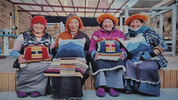 非遗工坊的藏族织女们笑容灿烂地展示“妮热”织造技艺成果。妈妈树供图