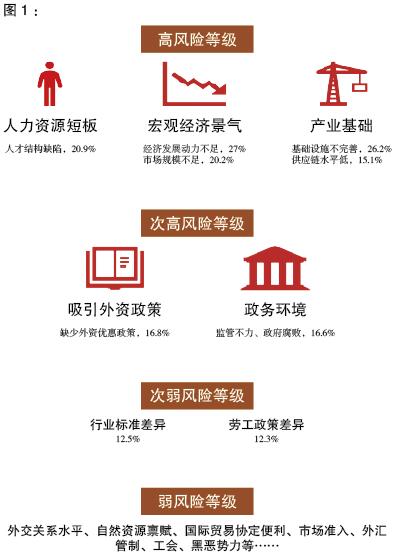 在调查问卷中,研究人员列出了中国企业在“一带一路”沿线国家投资运行可能面临的24项主要风险,并根据受访企业的应答结果对风险的严重等级进行了分类。研究结果显示,处在“高风险等级”的因素是人力资源短板、宏观经济景气不佳与产业基础薄弱;处在“次高风险等级”的主要是政府与政策问题,即政务环境、招商引资优惠政策问题。相对地,行业标准差异、劳工政策差异、自然资源禀赋、市场准入、外汇管制、外交关系、社会环境等因素的风险系数较低。