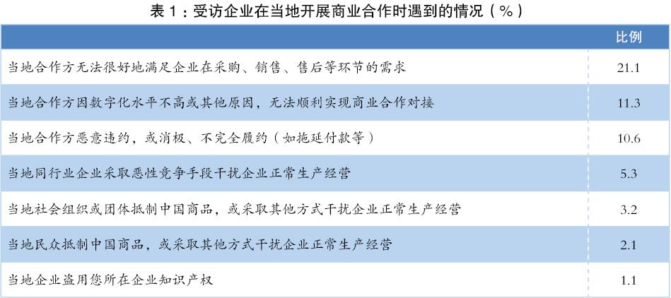 在企业面临的商业诚信问题方面,超两成受访企业表示“当地合作方无法很好地满足企业在采购、销售、售后等环节的需求”,这也是受访企业面临的最主要挑战。另外分别有约一成企业面临着受当地技术条件限制无法与当地合作方顺利实现商业对接的困境,或是受到当地合作方恶意违约、消极履约行为的掣肘。(见表1)