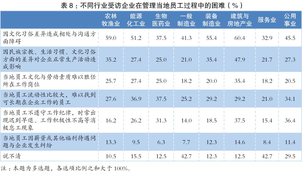 其八,跨文化沟通障碍与员工管理困难是各行业都面临的难题,建筑与房地产业尤甚。(见表8)