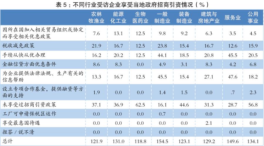 对于企业是否享有当地招商引资等优惠,不同行业也存在着差异。(见表5)