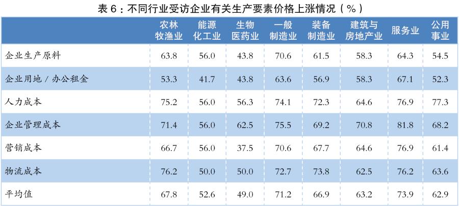 其六,各行业生产要素成本上涨压力普遍较大,各生产要素价格上涨大多不超过30%。(见表6)