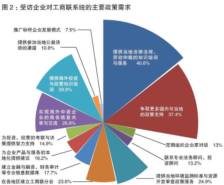 调查显示,受访企业对工商联系统服务民营企业“走出去”、助力民营企业在“一带一路”沿线国家发展的首要需求是“组织当地法律法规,尤其是劳动仲裁纠纷方面的知识培训与专业化服务”(40.6%);排在第二位的需求是“与国内和当地相关部门协调,争取更多政策支持”(37.4%);第三到五位的需求则分别是“海外投资与经营知识培训”(29.8%)、“搭建信息沟通平台,实现商务信息共享与投资经验交流”(26.8%)和“在当地组织环境监测标准、资源开发审查政策专业化服务”(24.9%)。(见图二)
