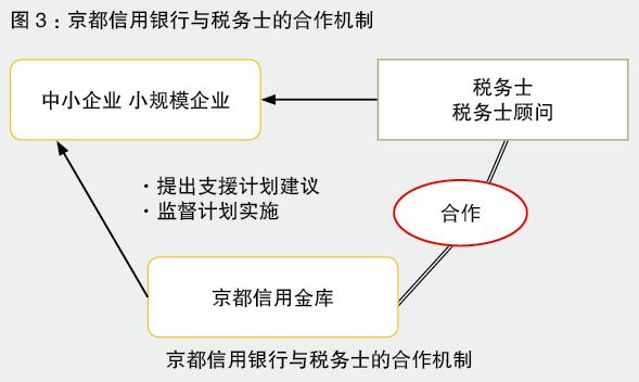 从2012年8月开始,日本政府实施“认定中小企业经营革新支援机关”制度:由经济产业省通过接受申报,主持考试、审查认证,授权从事中小企业经营革新的支援机构。到目前为止已认定授权了约2.5万个中小企业支援机构。它由五类机构组成:第一类是商工会、商工会议所、中小企业团体中央会等商会团体;第二类是税务、法务类支援机构,主要是税务士、会计士、咨询顾问等专业咨询机构和专家;第三类是金融机构;第四类是一些财团法人、社团法人、NPO法人机构;第五类是其他中小企业支援机构(主要是市町村自治体举办的中小企业支援中心)。通过这些支援机构对中小微企业的免费或有偿(政府补贴)辅导、咨询、支援,提高中小企业的管理水平,规范其财务制度和信息透明制度,尽可能把金融机构与中小微企业之间的信息不对称降到最低。其中商会组织(商工会议所、商工会)的作用特别明显,日本政府通过财政补贴,赋予商会对中小微企业的管理辅导特别是财务指导的职能,在此基础上又赋予向金融机构推荐融资的职能(见图2)。比如,日本政策金融公库有一项专门支持困难企业改善管理的专项贷款,其前提就是申请贷款的企业必须至少接受过商会六个月的管理指导。此外,许多商业银行在向中小微企业发放贷款时常常与相关会计士、税务士等合作,在发放贷款前,会同这些支援机构与申请贷款的企业共同协商,并委托参与的支援机构负责对贷款企业进行财务监督(见图3)。