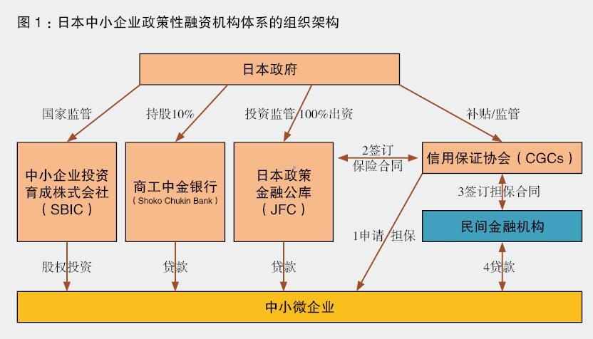 日本的中小企业政策性融资机构体系是由日本政策金融公库(JFC)、商工中金银行(Shoko Chukin Bank)、信用保证协会(CGCs)、中小企业育成投资株式会社(SBIC)所组成: