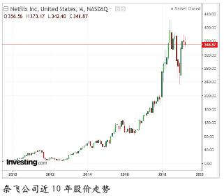 但这丝毫不影响资本市场对它的青睐。作为流媒体行业的巨头,奈飞曾被外界誉为一家现象级的公司,它靠股价涨幅掀起一轮“奈飞现象”。在2009-2018年的10年间,奈飞曾创造6168.47%的涨幅,这也是美股中涨幅最高的,在FAANG中相当于亚马逊的2.2倍、苹果的4.5倍。2018年6月21日,奈飞股价达到423.2美元/股、市值达到1840亿美元,这也让它超越迪士尼成为全球最大媒体公司。
